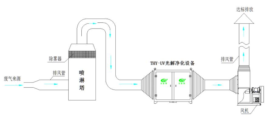第一階段:廢氣經(jīng)過一級(jí)水噴淋對(duì)廢氣中氨、醇等易溶于水的成分以及灰塵進(jìn)行去除預(yù)處理,再進(jìn)入下一道工序。